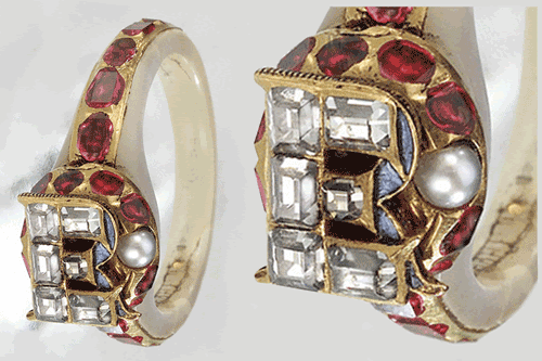Pas si sûr ! 22 ans plus tard, la petite Élisabeth monte sur le trône, sous le nom d’Élisabeth Ire. Et, au cours de son règne, elle se met à porter une bague tout à fait unique. Les matériaux utilisés sont très précieux : l’anneau est en nacre couvert de rubis, de perles et d’or.