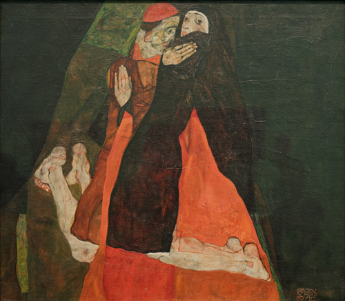 Au-delà du caractère résolument anti-clérical de l’œuvre, Schiele y exprime son propre mal-être, absent du Baiser de Klimt.
